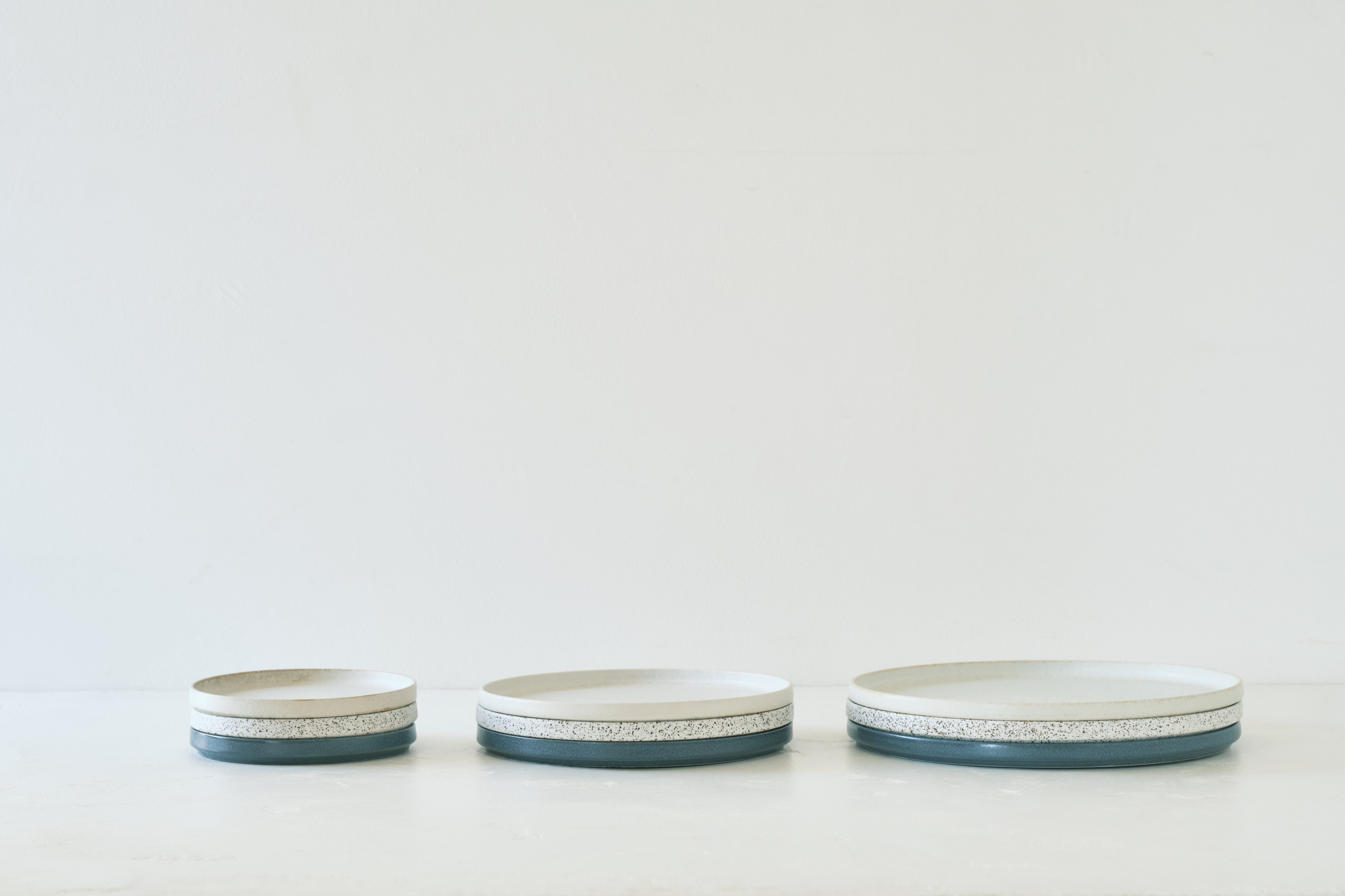 シンプルなデザインとマットな質感で使いやすい「白」と「灰」と、個性的な釉薬の表情が印象的な「錆点」をご用意。さらに重ねられるため、コンパクトに収納することができます。